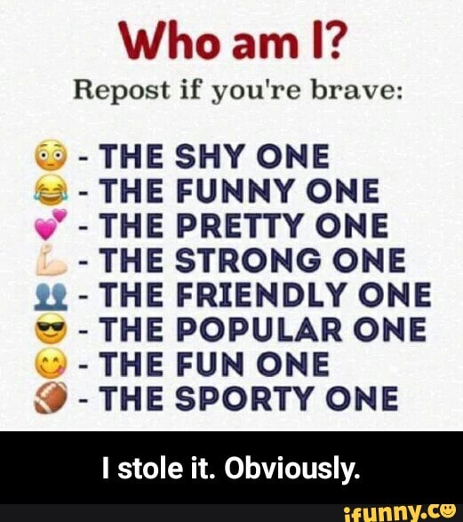Who Am I Repost If You Re Brave 55 The Shy One C The Funny One The Pretty One The Strong One The Friendly One As we update our service, these third party tools can affect twitch's performance.